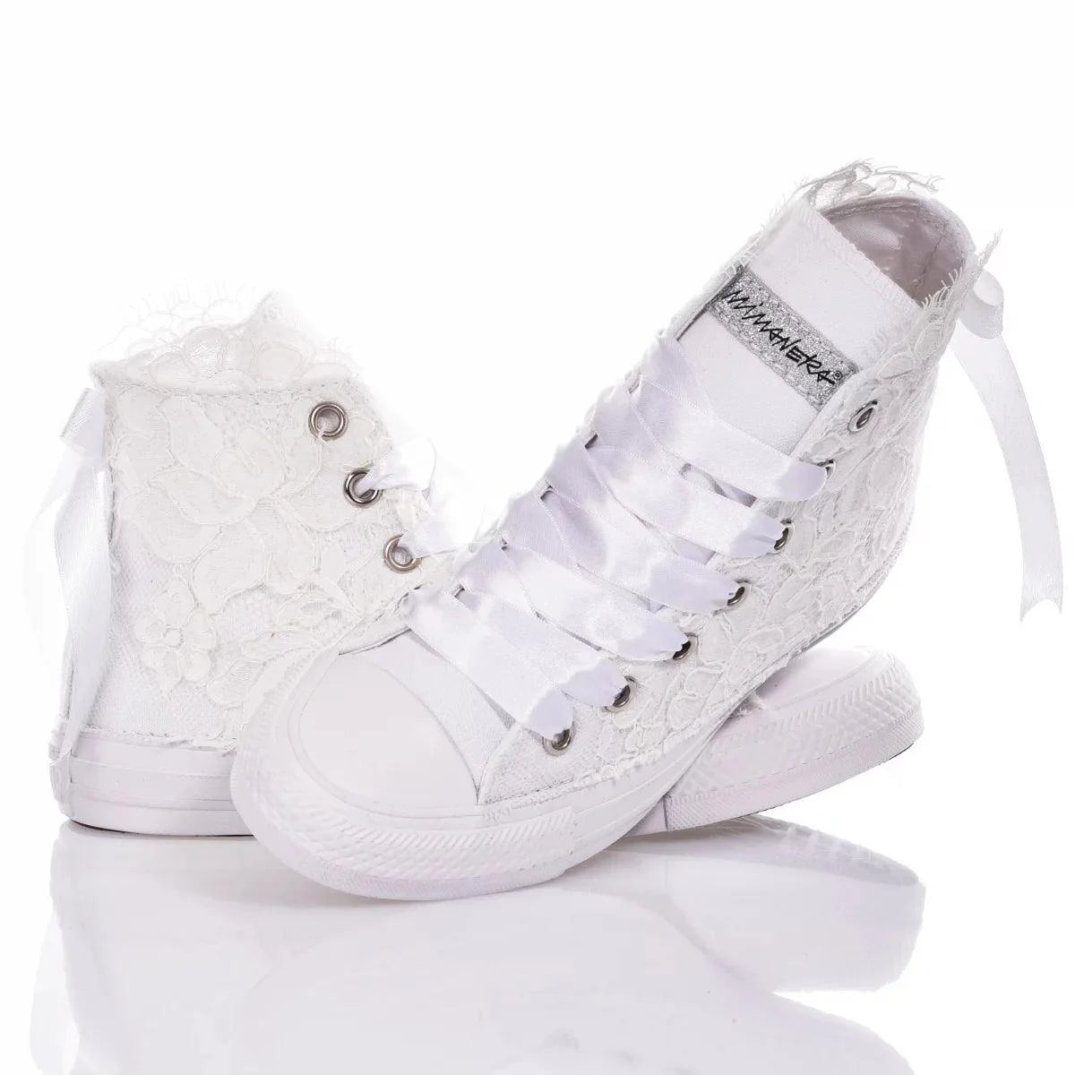 Converse Amabel, una scarpa da sogno sui toni candidi del bianco, ricoperta da un particolare pizzo ricamato con fiocco in raso sul retro, tutto impreziosito da una fila di Swarovski crystal sul retro. Questa scarpa farà sognare mamma e figlia e sarà perfetta anche per accompagnarvi nel tuo giorno speciale, o qualunque sia la vostra meta. La Converse All Star Amabel ti verrà fornita con lacci in raso bianco ed i suoi originali bianchi.