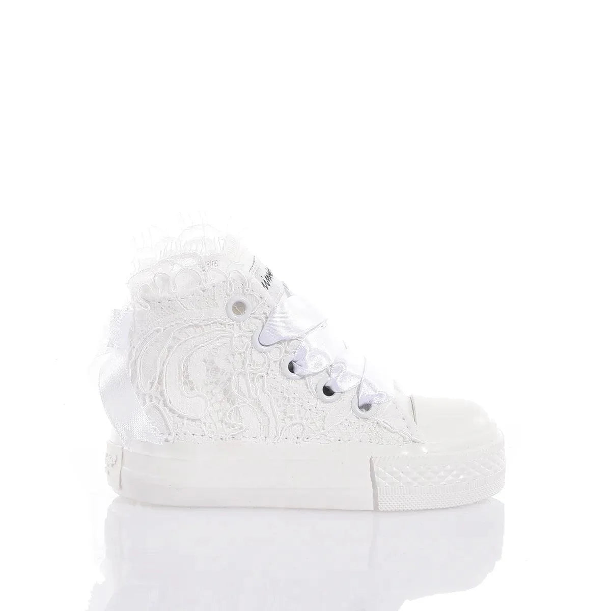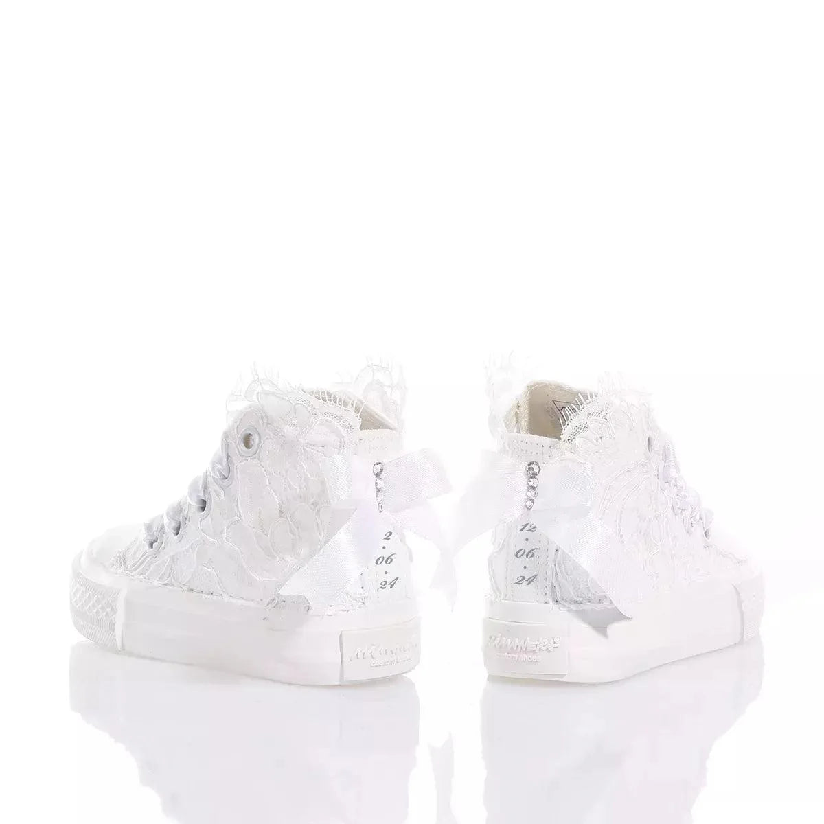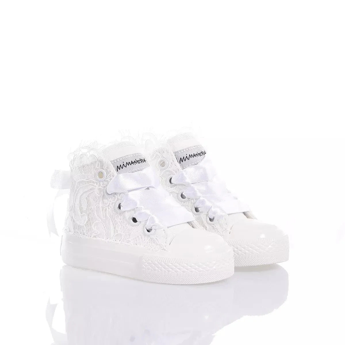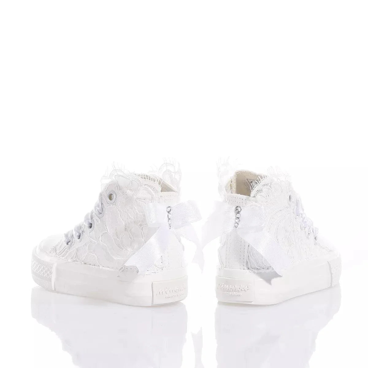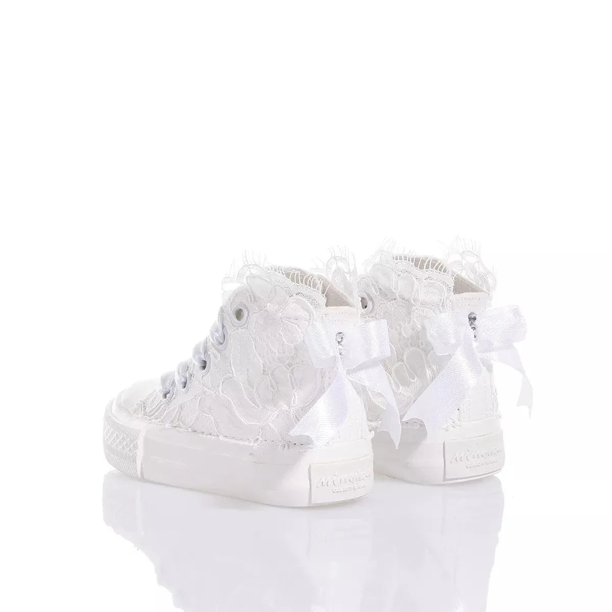 Mimanera Airlines Baby Amabel è ricoperta da pregiato pizzo ricamato con fiocco in raso sul retro, tutto impreziosito da una fila di cristalli Swarovski sul tallone e lacci in elegante raso bianco.
