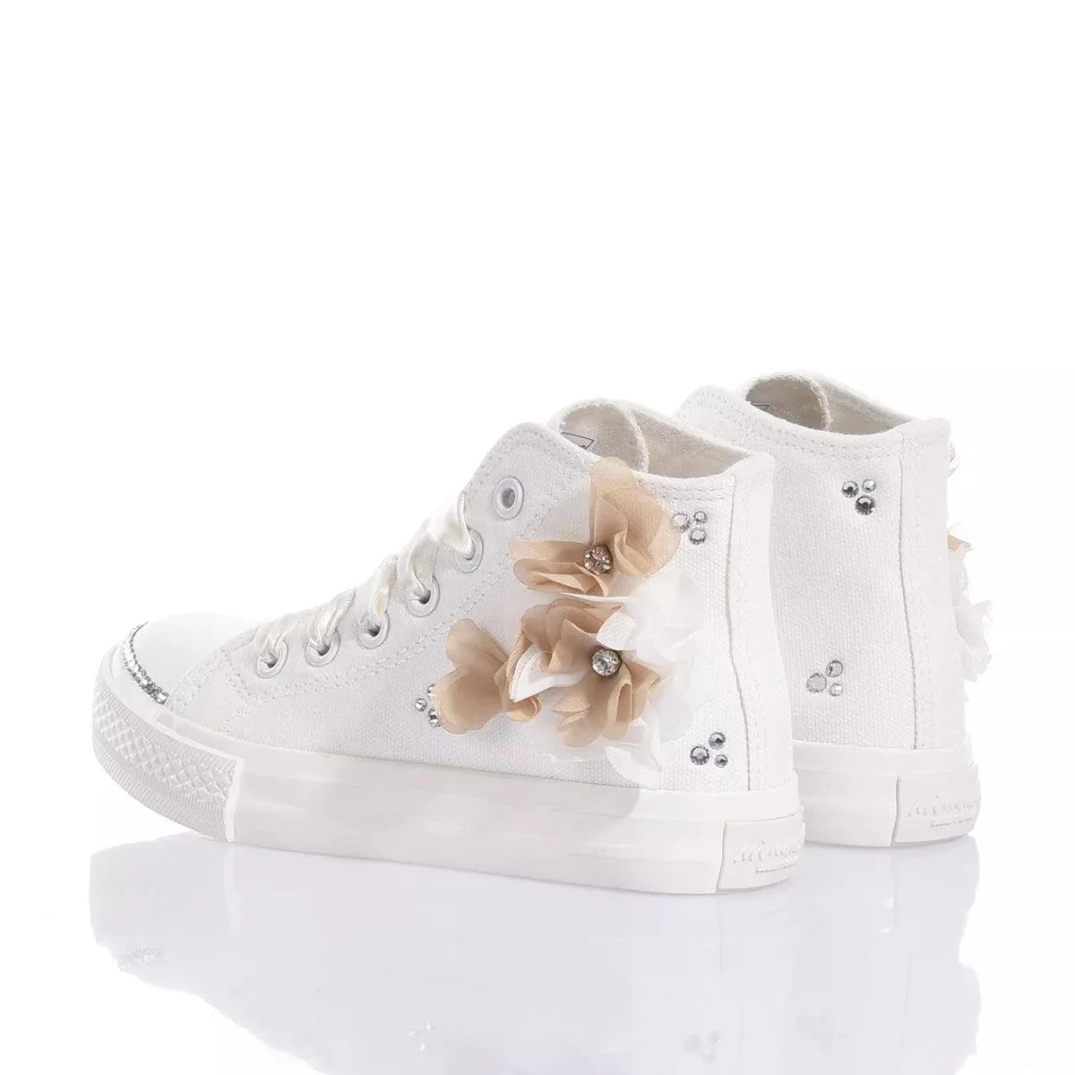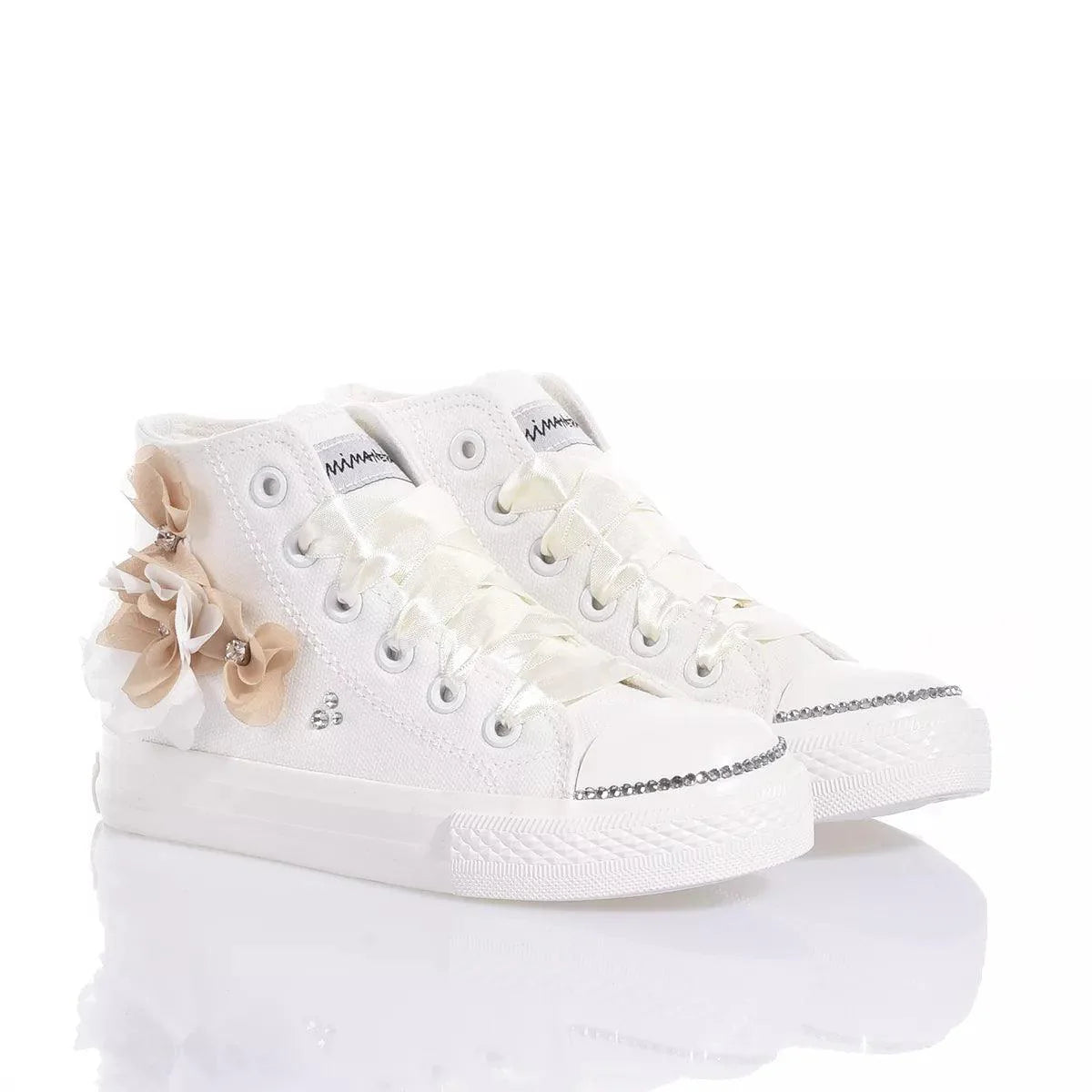 Mimanera Airlines Junior Diana: l'incarnazione dell'eleganza e della comodità. Ispirate al classico modello Converse, queste scarpe offrono una suola completamente bianca. Mimanera Airlines Junior Diana presenta delicate applicazioni di fiori nei toni del bianco e beige, impreziositi da castoni e cristalli Swarovski che aggiungono un tocco di luce e brillantezza abbinata a raffinati lacci in raso panna.