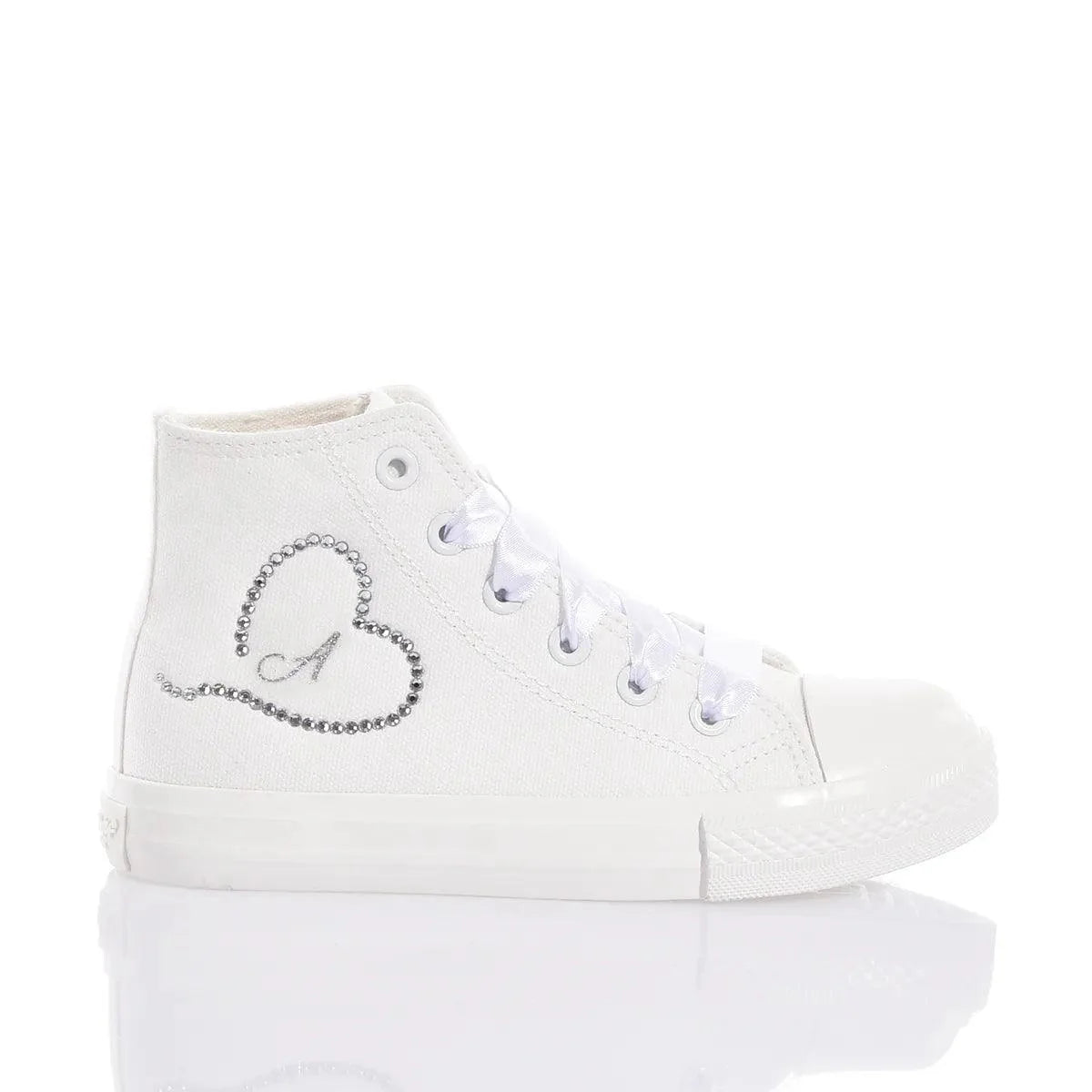 Mimanera Airlines Junior Heart è un piccolo gioiello ispirato al classico modello Converse ma offrendo una suola completamente bianca per renderla ancora più delicata ed elegante. Un cuore di Swarovski fa da cornice all’iniziale del nome della tua bambina in glitter argento, un modo sofisticato di personalizzare la sneakers anche per i più piccoli. I delicati lacci in raso bianco completano il look della Mimanera Airlines Junior Heart.
