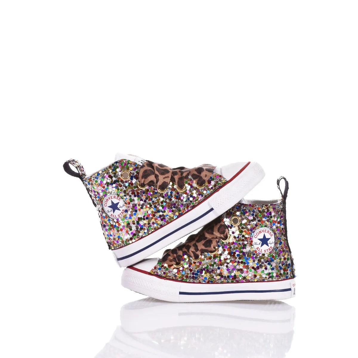 Converse Baby Tiger Rainbow è la sneakers personalizzata pensata per i più piccoli! Un mix di micro paillettes multicolori e una vivace fantasia zebra decorano i lati di questa scarpa, creando un effetto irresistibile. A completare il look ci pensano i lacci leopardati, che aggiungono un tocco di originalità.
