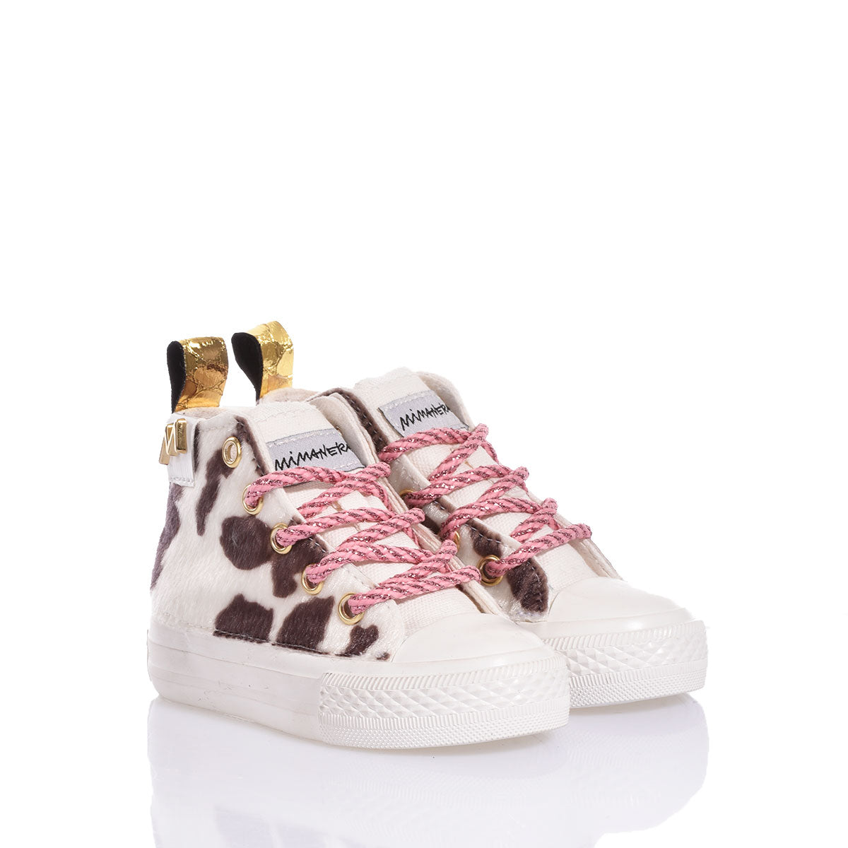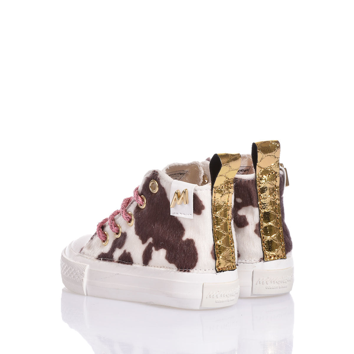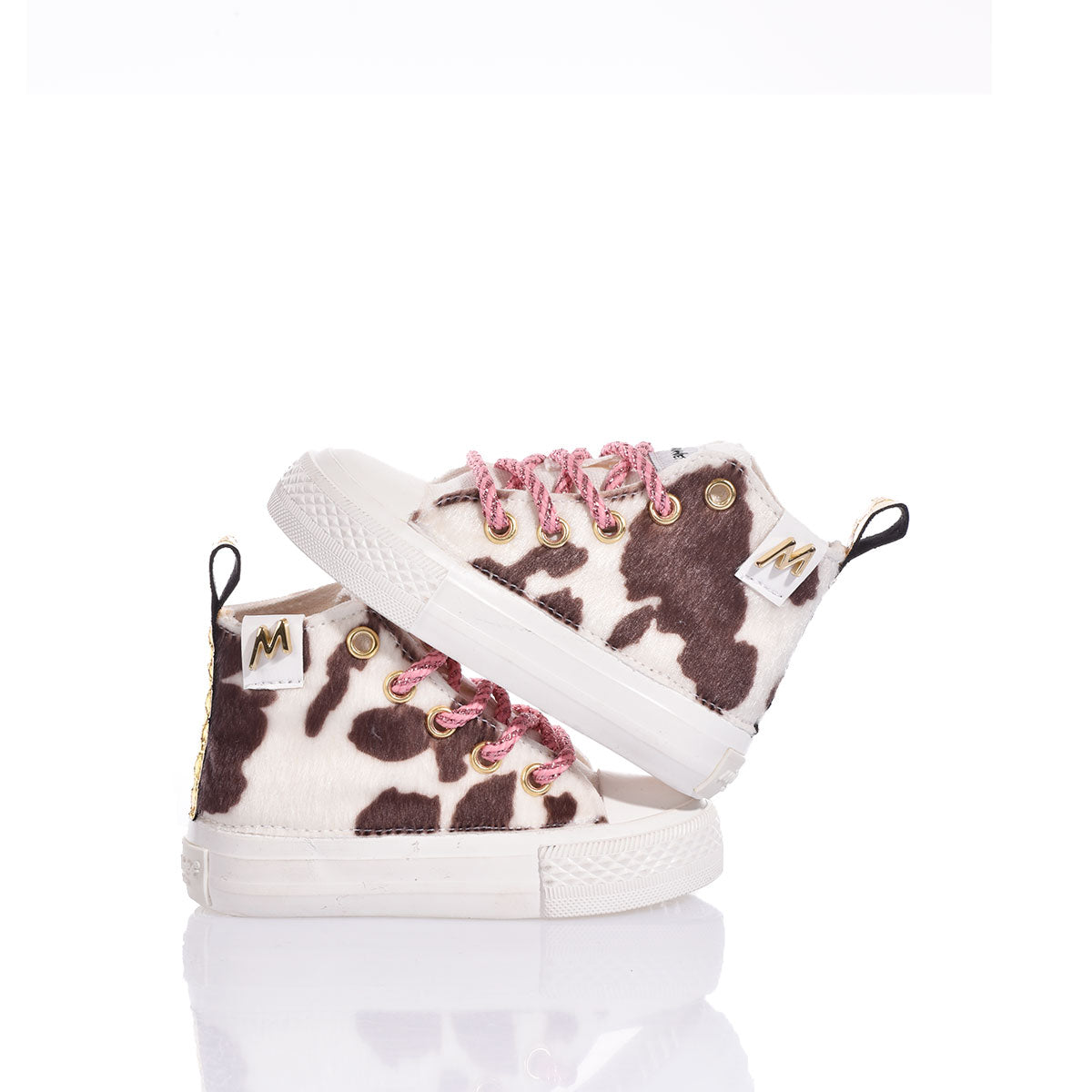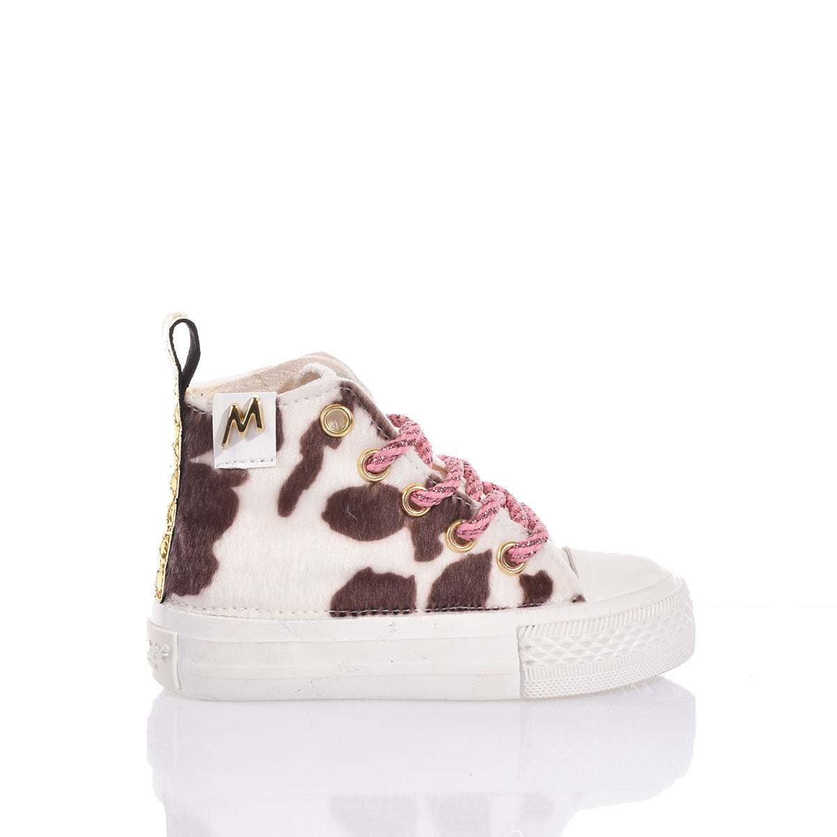 Mimanera Airlines Baby Cow è la sneaker perfetta per piccoli look da veri protagonisti. Ispirata al modello Converse, è rivisitata con uno stile divertente e ricercato. La tomaia in morbido tessuto effetto cavallino con stampa mucca regala un tocco originale e irresistibile, mentre il retro in ecopelle con stampa pitonata oro aggiunge un dettaglio brillante e chic. I lacci torchon rosa con fili lurex completano la scarpa con una nota delicatamente luminosa.