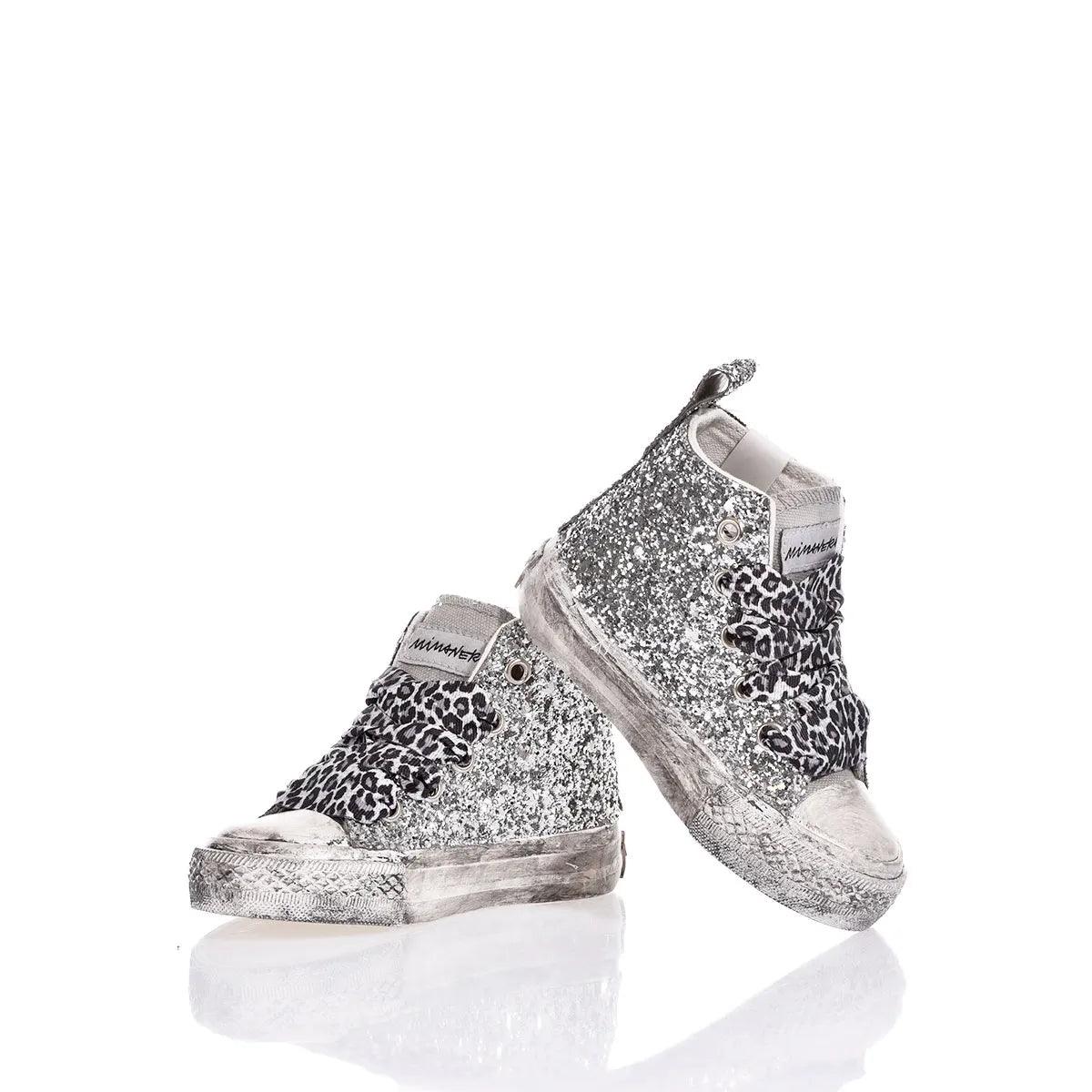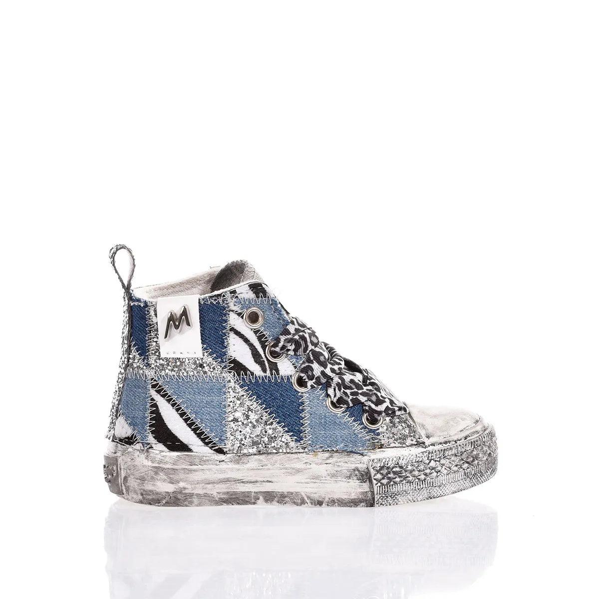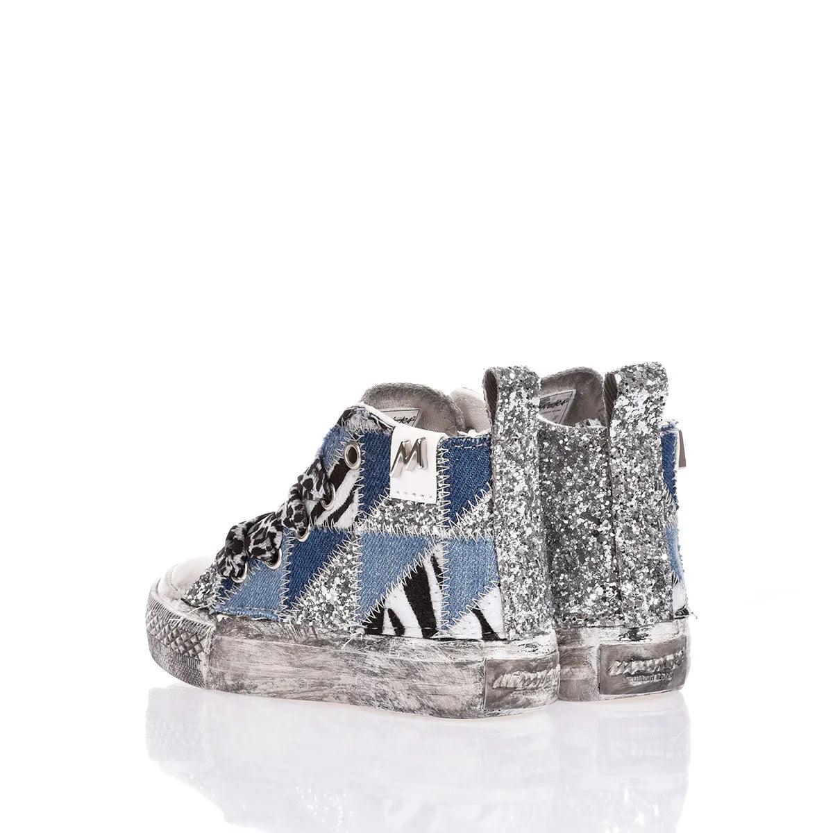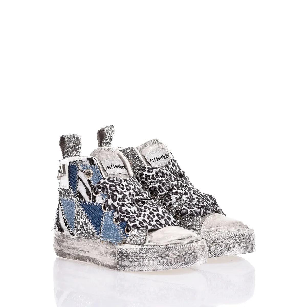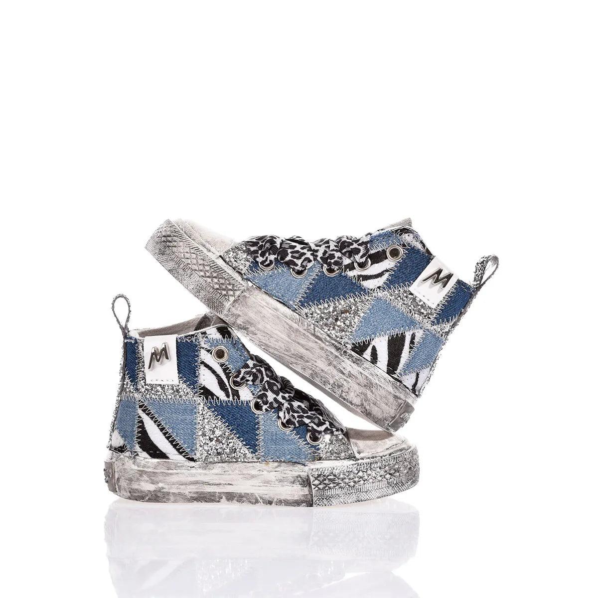 Le Mimanera Airlines Baby Denim Patch uniscono stile e comfort. Ispirate al classico modello Converse, queste sneakers presentano un ricamo patchwork esterno con glitter e fantasia zebrata e differenti tonalità di denim creando un look unico, mentre il retro e il lato interno in glitter argento aggiungono un tocco elegante. Il laccio leopardato completa il look e la linguetta, insieme alla suola delavata, conferiscono un effetto vintage e street.