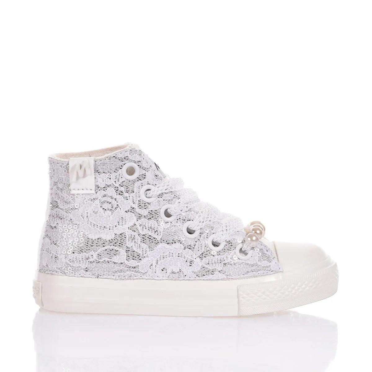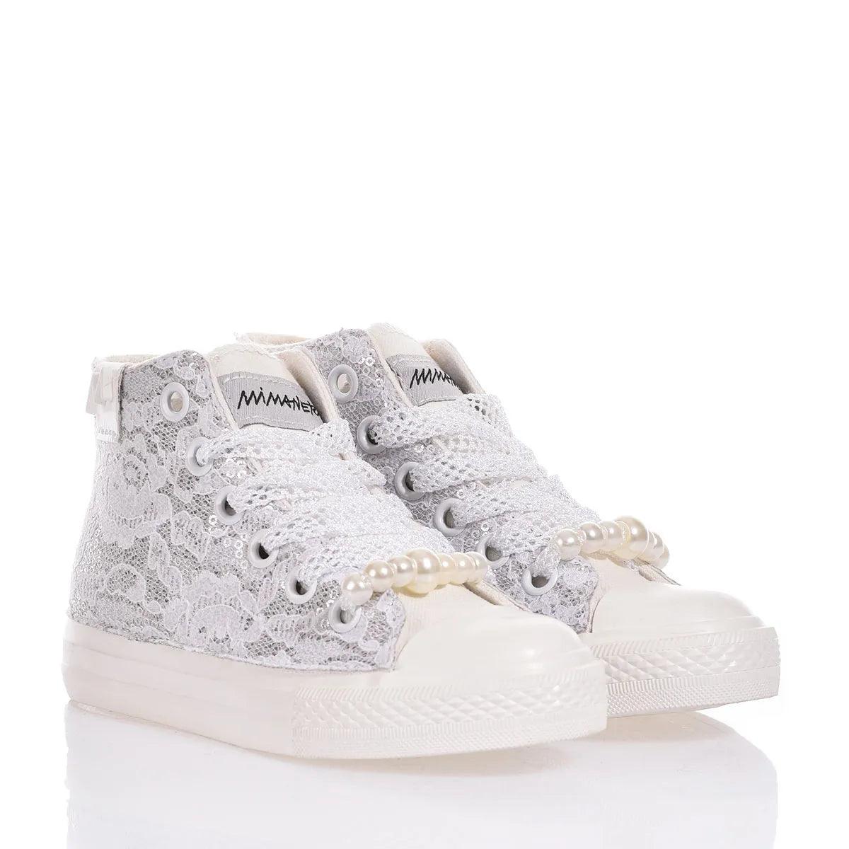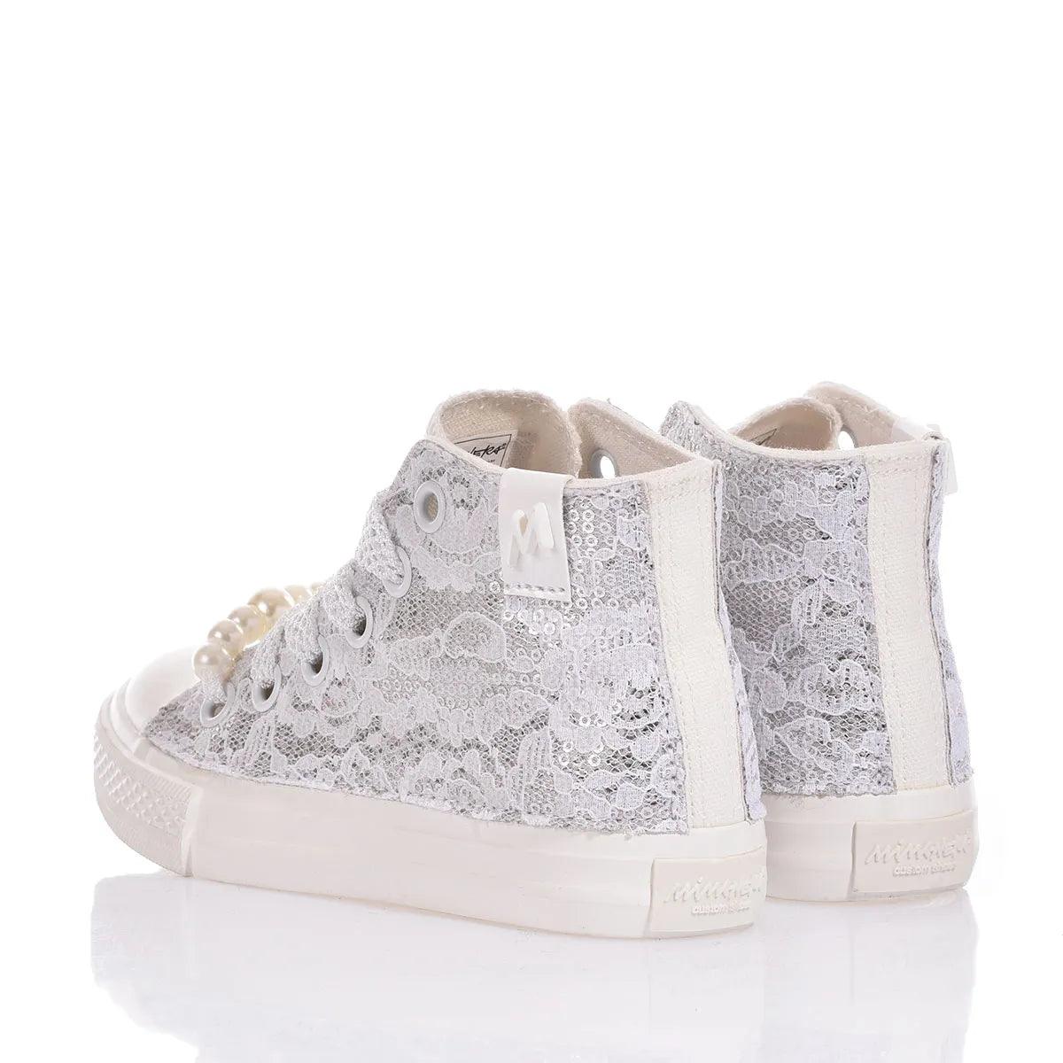 Ispirate al classico modello Converse, queste sneakers con suola completamente bianca e dal design esclusivo con tessuto ricoperto di paillettes argento con un delicato strato di pizzo bianco sovrapposto che crea un contrasto raffinato. Completano il look di questa scintillante sneakers i lacci traforati in bianco con perle rimovibili sul fondo dell’allacciatura.