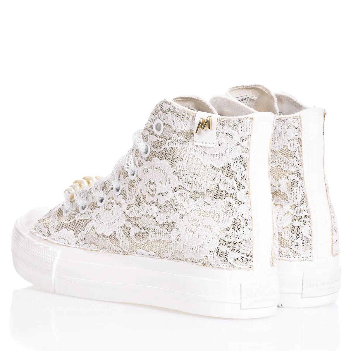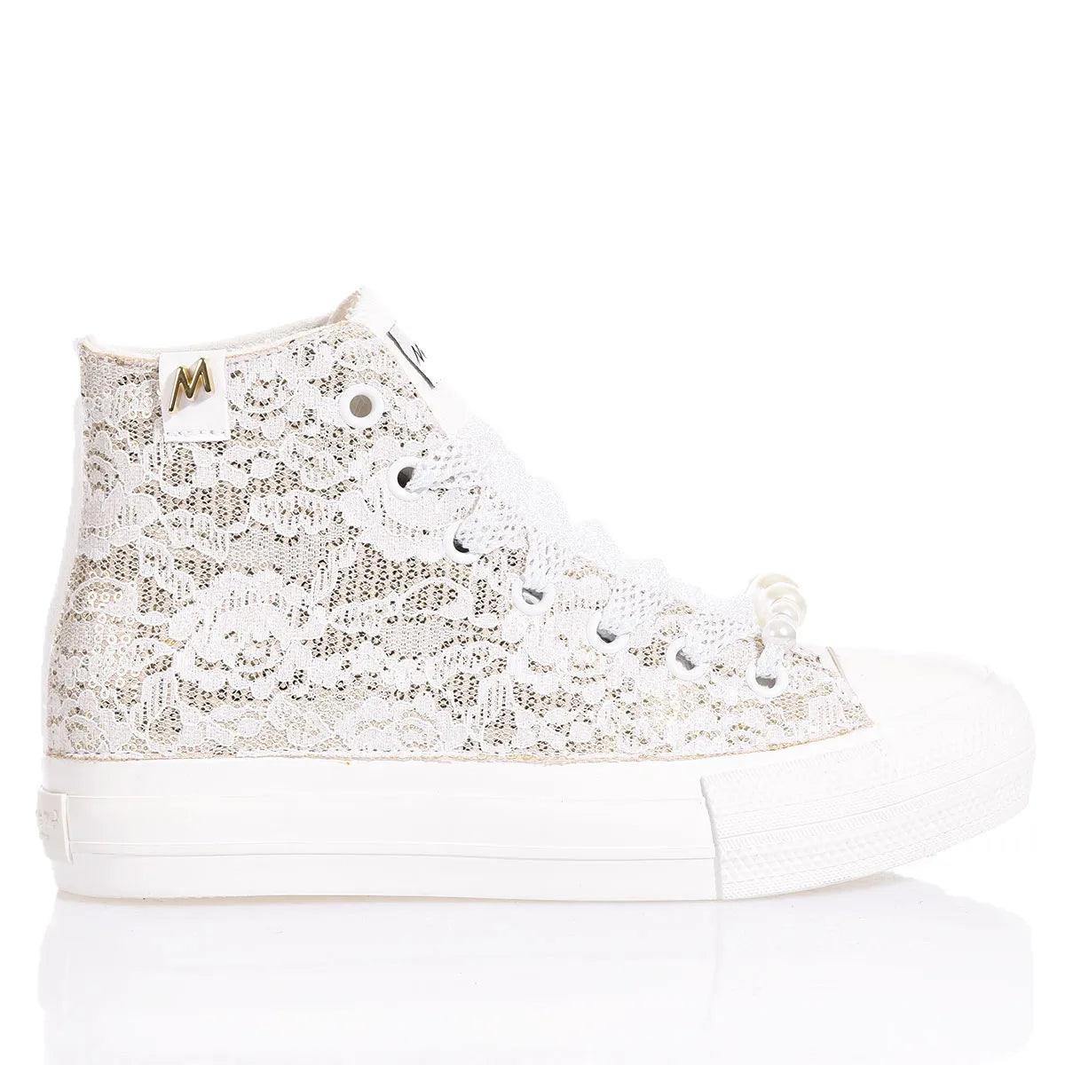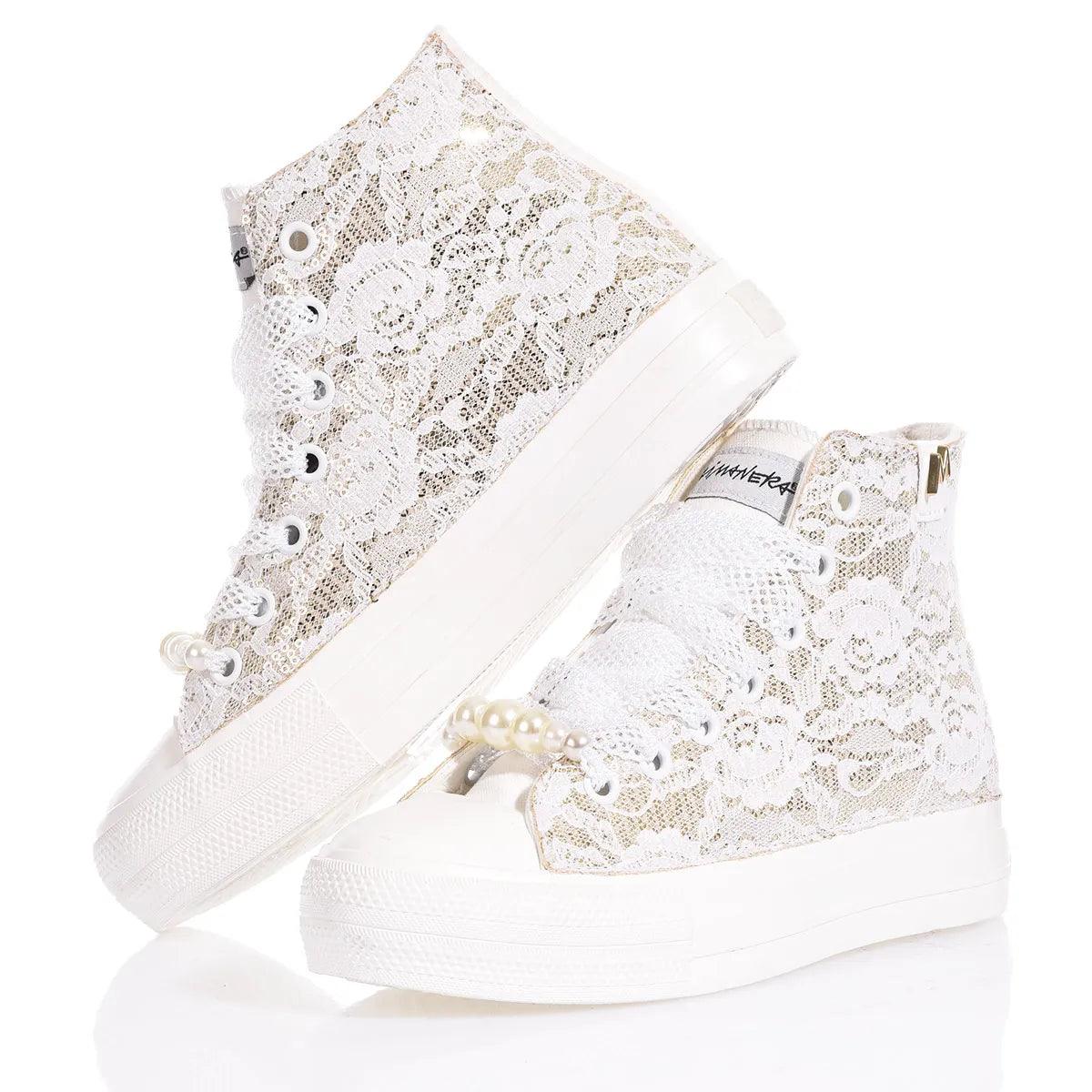 Ispirate al classico modello Converse, queste sneakers con suola platform completamente bianca sono pensate per slanciare la figura garantendo un comfort eccezionale. Il design esclusivo delle Mimanera Airlines Platform Bea Gold si distingue per il tessuto ricoperto di paillettes in oro chiaro con un delicato strato di pizzo bianco sovrapposto che crea un contrasto raffinato, unendo l’eleganza del pizzo alla brillantezza dorata per un effetto finale romantico e chic. Completano il look di questa scintillante sneakers i lacci traforati in bianco con perle rimovibili sul fondo dell’allacciatura.