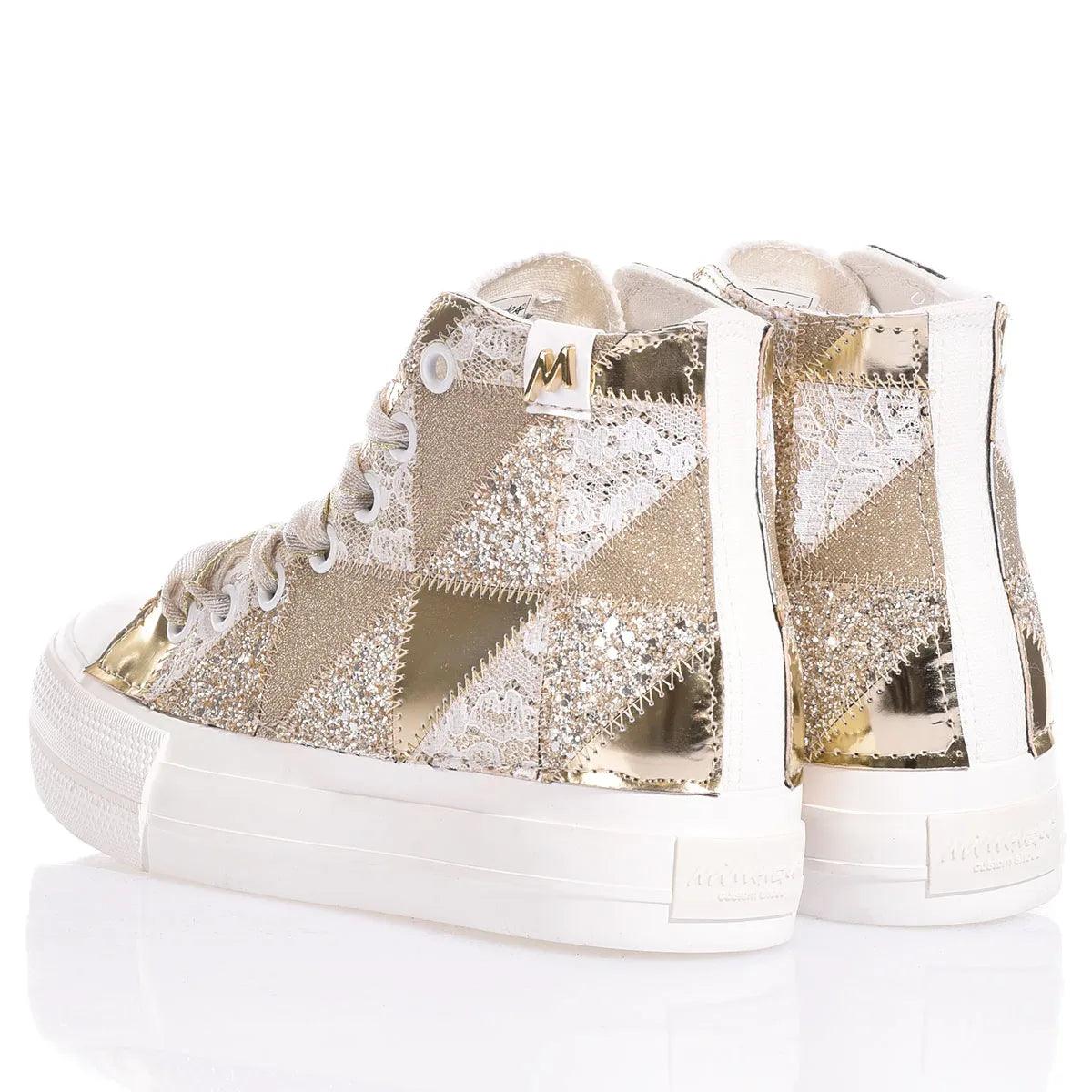 Mimanera Airlines Platform Gold Patch è la sneakers poliedrica ed elegante di questa stagione. Ispirate al classico modello Converse, queste sneakers con suola platform completamente bianca sono pensate per slanciare la figura garantendo un comfort eccezionale. Interamente rivestite da un patchwork finemente realizzato con diversi materiali pregiati e tutte nelle tonalità oro per un look glamour e sofisticato.