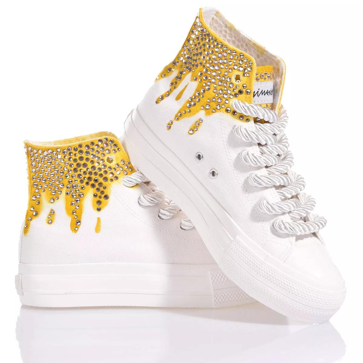 Mimanera Airlines Platform Honey è la sneakers custom per la donna che vuole lasciare il segno! Una cascata di Swarovski sulle calde tonalità del miele su lati e linguetta dona un effetto super luminoso e prezioso, proprio come i mega lacci torchon bianchi.