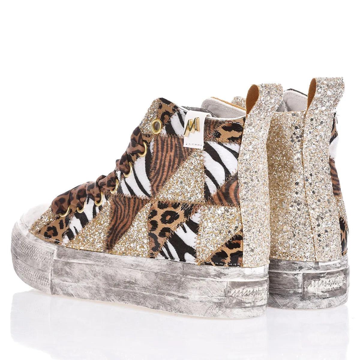 Il ricamo patchwork esterno con glitter e fantasie animalier crea un look unico, mentre il retro e il lato interno in glitter light gold aggiungono un tocco elegante. Il laccio leopardato completa il look e la linguetta, insieme alla suola delavata, conferiscono un effetto vintage e street.
